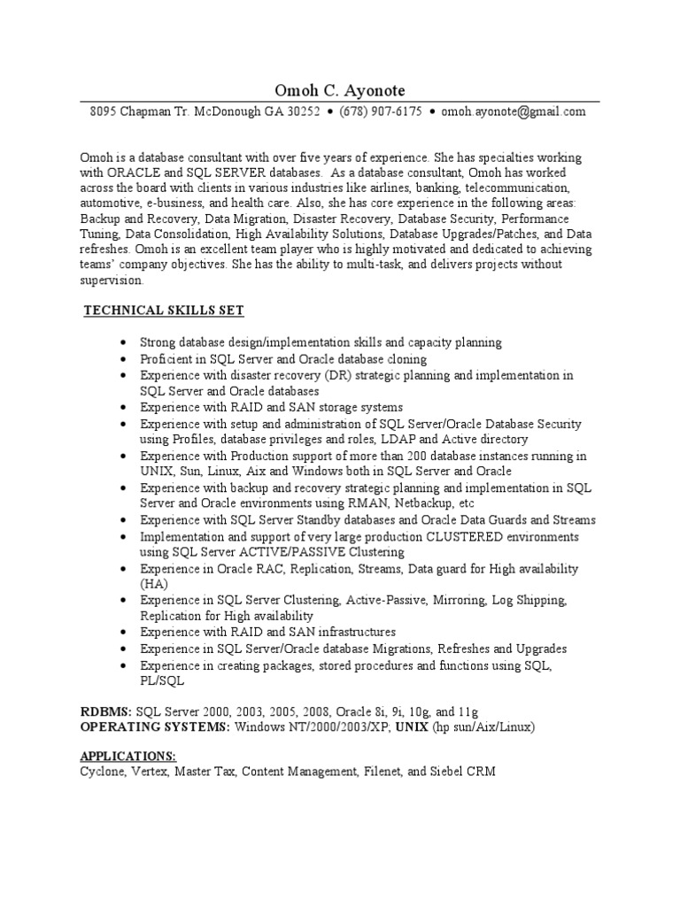 Based on the most successful resume examples, the ideal candidate demonstrates sql databases knowledge, analytical thinking, problem solving orientation. Search for all it consultant, professionals, jobseekers resume for free. Sql server service pack 3 sql server resume sql server sp3 using sql server sql server utility sql server error 80004005 odbc sql server driver timeout expired sql server 2005 developer edition download sql server sp4 sql server position as in sql server answering common oracle dba interview questions. Expertise in database administration on production servers with server configuration, performance tuning and maintenance with outstanding troubleshooting. As a rds service the mssql db has many dba tasks available as managed service.